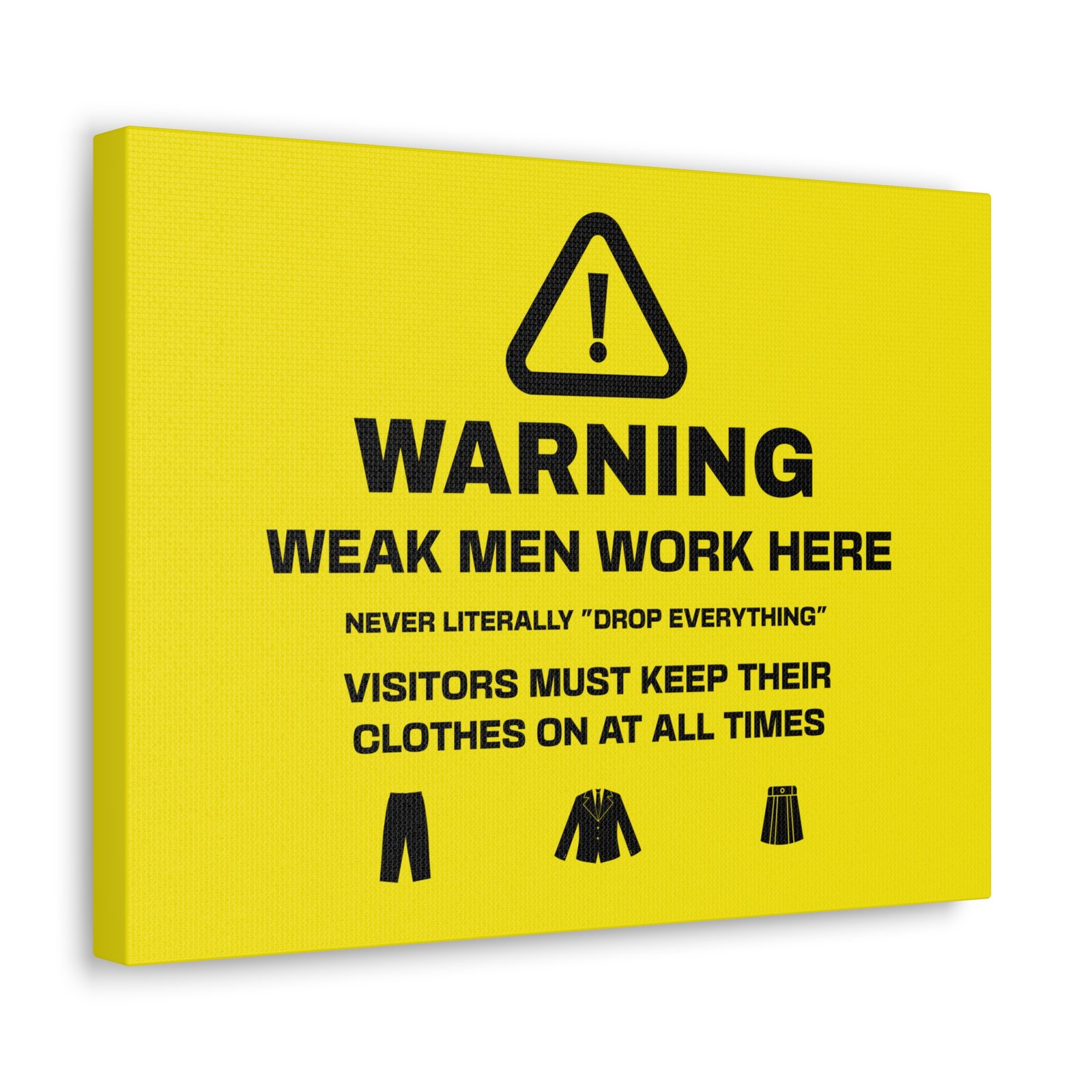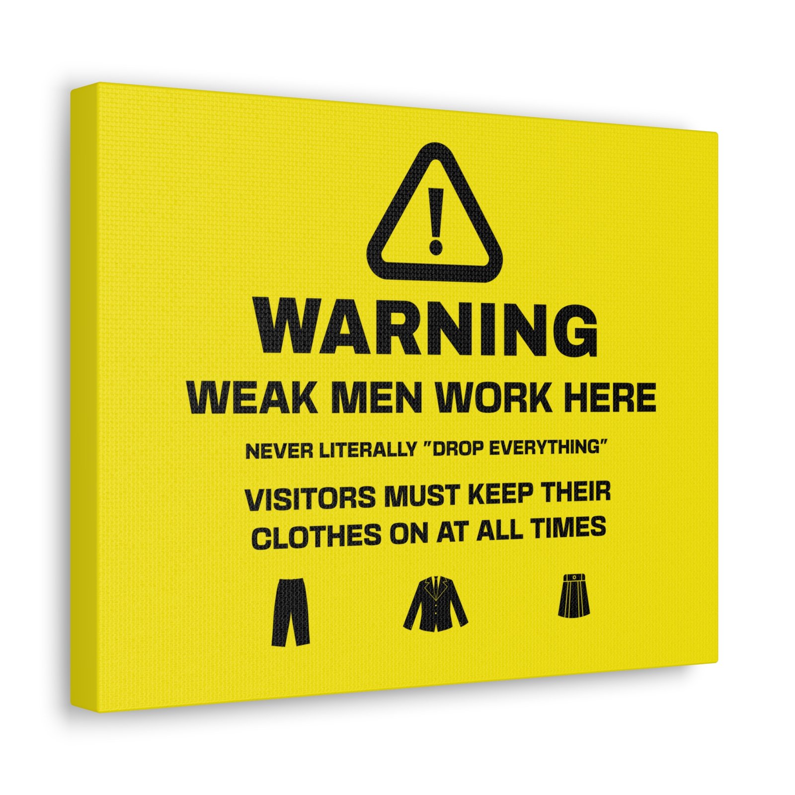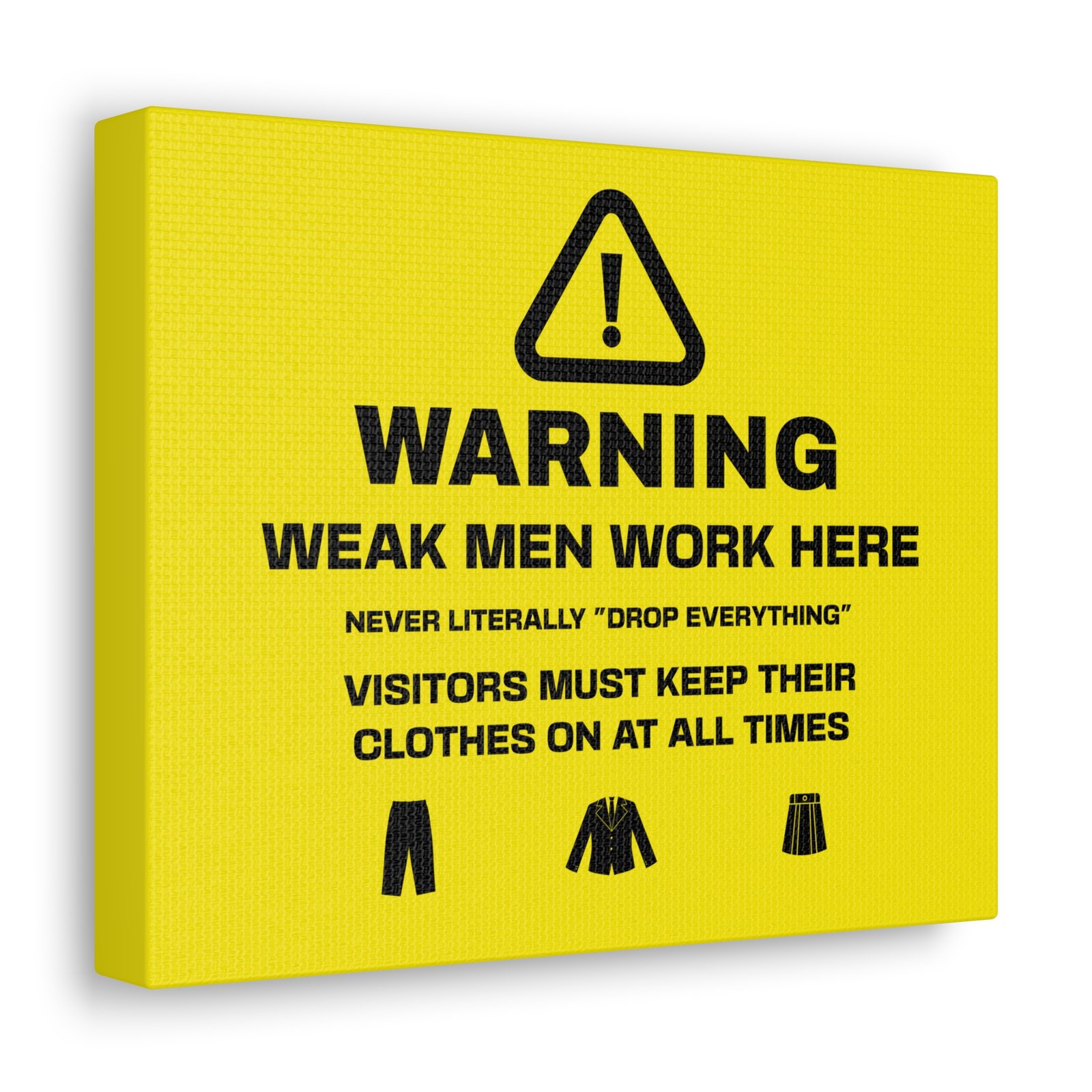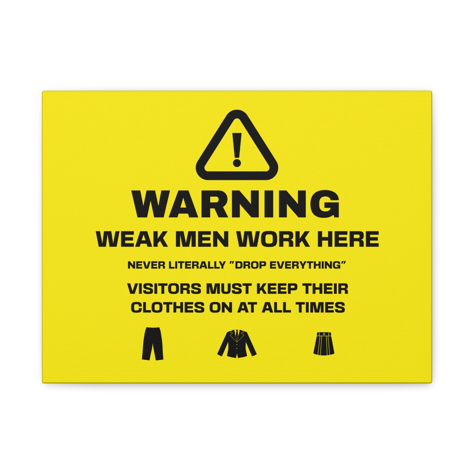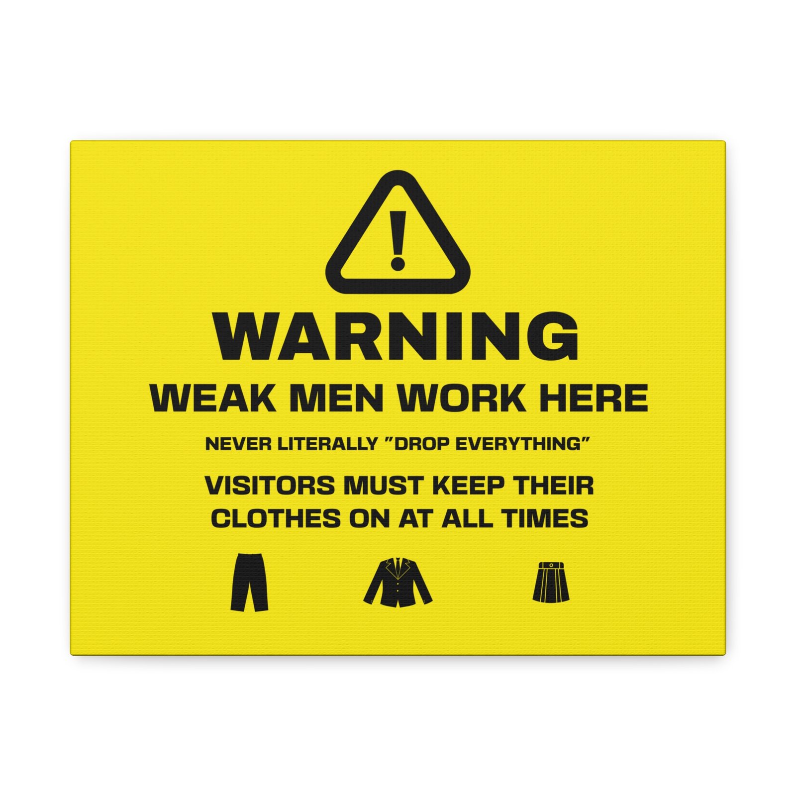Gentlemen: feel supported and understood with highly disclaimered art that’s printed on top-quality canvas gallery wraps. Each wrap is made with finely textured, artist-grade cotton substrate which helps reproduce your image in outstanding clarity and detail. Available in multiple sizes, these closed back canvases are built with a patented, solid support face and are excellent for indoor use.